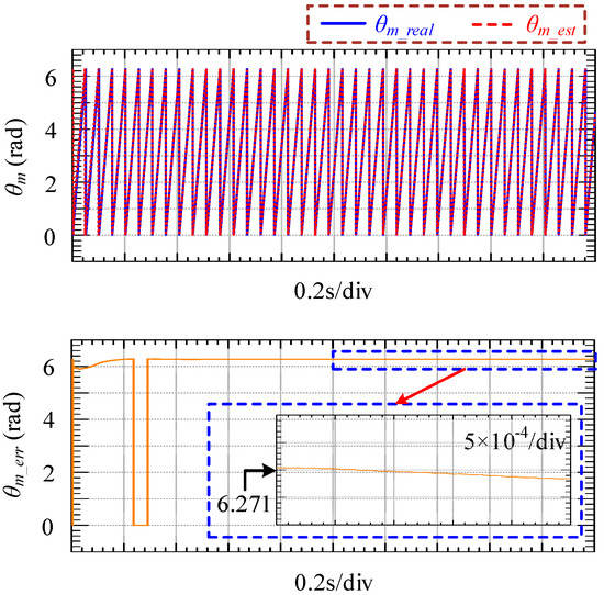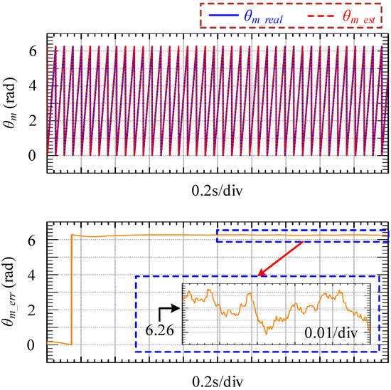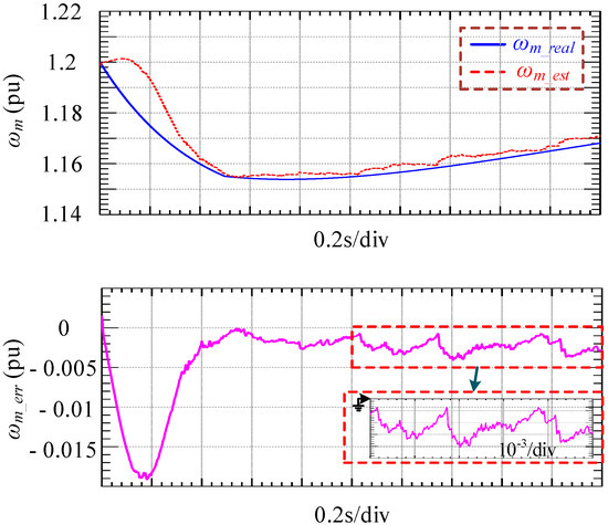 In Figure 20 and Figure 21, although there are noises caused by system model uncertainties and measurement disturbances, the estimated rotor speed and position still track the real values well, whereas the estimation accuracy decreases. With the noises added, the EKF has to repeatedly calculate the optimal Kalman gain to minimize the error, which takes several time periods. As can be seen from Figure 20, the error between the real and estimated rotor speeds is within 4 × 10−3 pu, while it keeps fluctuating. In Figure 21, there is approximately a difference of 6.26 rad (0.0232 rad) between the real and estimated rotor positions, with the fluctuation of ±0.02 rad. Nevertheless, the estimation precision is still good enough as divergence does not occur in this case, and the EKF based speed/position sensorless control algorithm is demonstrated to be robust to noises.