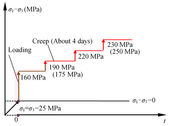 Rock triaxial rheological testing equipment (TOP INDUSTRIE, Grand Paris, France), whose allowed maximum values of deviatoric stress, confining pressure and pore pressure with water were 400, 70 and 40 MPa, respectively, was used to perform creep experiments. In an effort to overcome the influence of specimen differences, a stress stepping methodology was adopted for a single specimen; until the specimen eventually ruptured []. Hence, the specimens were first subjected to hydrostatic pressures of 25 MPa and deviatoric stresses were applied to 160 MPa (the first stress level was slightly greater than the lowest σcd) under pressure-controlled conditions of 5 MPa/min. They subsequently deformed for approximately 4 days under static compressive stress, after which the deviatoric stress was applied at next level. The above procedures were repeated until failure occurred. The loading procedure is shown in Figure 1.