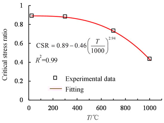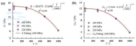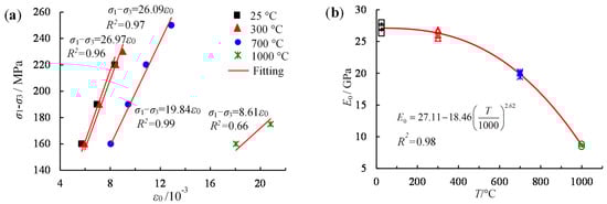In particular, the fit line slopes represent the instantaneous deformation modulus (E0), which decreased with temperature, although the square of the correlation coefficient (R2) of the specimens at 1000 °C was not very high. It can be observed that the decrease in E0 with increasing temperature was non-linear. Its nonlinear correlation (for the average values at each temperature) can be fitted by the equation shown in Figure 2b.