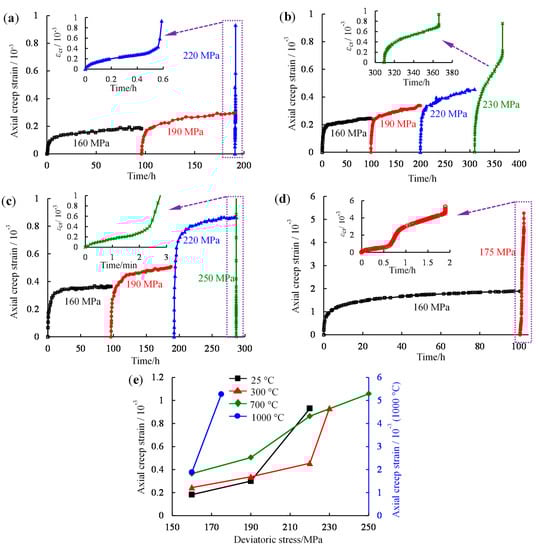 Axial creep strain-time curves under step-loading with σ3 of 25 MPa at different temperatures: (a) 25 °C; (b) 300 °C; (c) 700 °C; (d) 1000 °C; (e) Relationship between axial creep strain and deviatoric stress.
