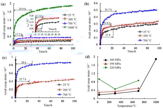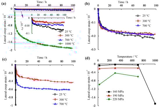 The lateral creep strains of the specimens at different temperatures under partial stresses of 160, 190 and 220 MPa, respectively, are shown in Figure 6. In Figure 6a, it is obvious that the lateral material dilatancy at 1000 °C exceeded those of the others by in excess of an order of magnitude. Furthermore, as the temperatures increased from room temperature to 300 °C the lateral creep strains decreased remarkably but increased when the temperature increased to 700 °C. Similarly, the lateral creep strains first decreased and then increased slightly before and after 300 °C under a static stress of 190 MPa, as shown in Figure 6b. From Figure 6c, when the loading reached 220 MPa, the failure and lateral expansion of the specimens at room temperature were rapid. According to the relationship between lateral creep strain and temperature, as shown in Figure 6d, it can be concluded that the lateral creep strains first decreased at temperatures below 300 °C and then increased when the temperatures rose above 300 °C.