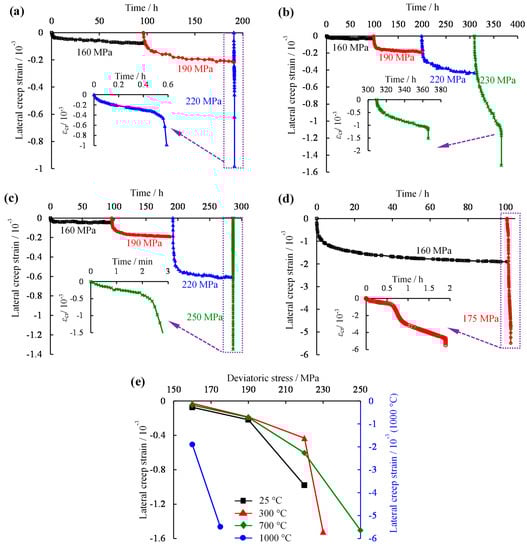 Lateral creep strain-time curves under step-loading at different temperatures (σ3 = 25 MPa): (a) 25 °C; (b) 300 °C; (c) 700 °C; (d) 1000 °C; (e) Relationship between lateral creep strain and deviatoric stress.