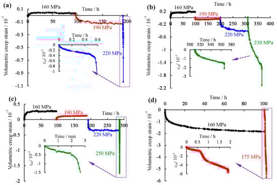 Figure 7 shows the relationships of volumetric creep strain and time under increased loading for the specimens at different temperatures. From Figure 7a, the volumetric creep strain was positive under a deviatoric stress of 160 MPa, whereas it became negative when the loading exceeded 190 MPa for the specimen at 25 °C. Analogously, the specimen at 300 °C also shows this characteristic in Figure 7b. As the temperatures were elevated to 700 °C, the volumetric creeps were positive and decreased as the deviatoric stresses increased from 160 to 190 MPa. They subsequently became negative and, in reverse, increased under the loadings exceeding 190 MPa. In particular, for the specimens at the highest temperatures, the volumetric creep strains were always negative under the deviatoric stresses of 160 and 175 MPa. According to the relationship between volumetric creep strain and deviatoric stress, as shown in Figure 7e, in which lateral expansion increased with increasing differential stress and temperature, as the stress levels gradually increased the specimens at first compressed and then dilated and eventually failed by shear dilatancy.