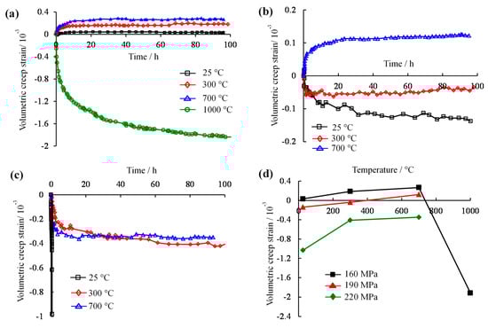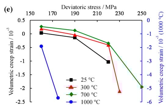 This suggests that the former experienced shear dilatancy, whereas the latter experienced compression. When the partial stresses rose to 190 MPa, the two specimens at 25 and 300 °C were negative, indicating that the deformations were dominated by shear-dilatancy, whereas the specimen at 700 °C was still compression-dominated, or positive (Figure 8b). Because that stress level was nearer to the σp of the specimens at 25 °C, the volumetric creep slope exceeded that for 300 °C. From Figure 8c, as the stresses increased to 220 MPa, the 25 °C specimen experienced serious shear dilation in a short time, and the others behaved similarly but did not fail. This dilation was closer to the σp of the specimen at 300 °C at that stress level, and the specimen at 300 °C with a marginally higher development strain rate in comparison with that at 700 °C can be seen in Figure 8c. The relationship between volumetric creep strain and temperature were shown in Figure 8d. It is clear that compression was given prior to expansion when temperature was below 700 °C.