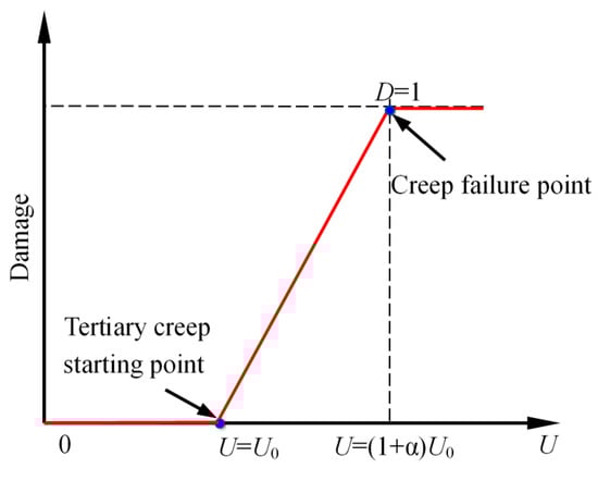 where U is the strain energy, U0 is the critical strain energy corresponding to the initial damage, and the strain energy can be calculated using Equation (2), α is a parameter related to the material creep property and always exceeds 0. D is the damage variable. When D = 0, no damage occurs during the creep process. D = 1 corresponds to materials that suffer only creep failure. Therefore, 0 < D < 1 corresponds to materials with various extents of damage during the creep process.