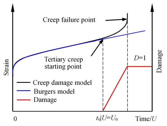 Natural rocks have various scales of macro- and micro-defects, and their deformation and damage are therefore inevitably affected by those inherent flaws. In addition, their failure processes are often accompanied by the evolution, development, coalescence and interaction of cracks []. Therefore, rock rheological constitutive models that consider evolutionary rules of rock damage can more reasonably describe the rheological behaviors of rocks. In consequence, the following parts will introduce the damage process during the creep stage, and a creep damage model will be established.