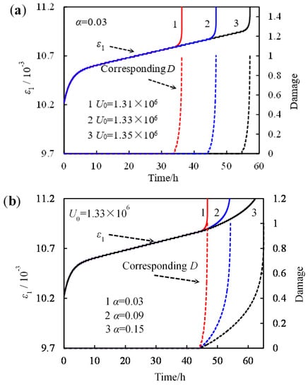 Influence of U0 and α to strain curve and damage: (a) α = 0.03; (b) U0 = 1.33 × 106 (Note: K = 10 GPa, GM = 10 GPa, GK = 250 GPa, ηM = 10,000 GPa·h and ηK = 500 GPa·h).