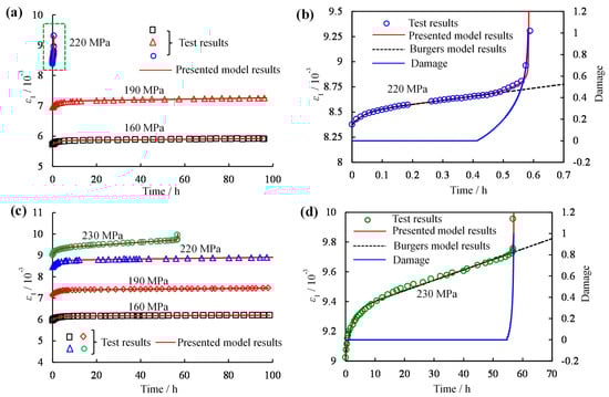 From Figure 13, the creep damage model curves agree well with the experimental data, and the modified model is therefore reasonable and simple. According to Figure 13b,d, the Burgers and creep damage models produced the same fitting results during the primary and steady creep state stages. However, the creep damage model accurately reproduced the tertiary creep phase, whereas Burgers model was unable to describe the accelerated creep process when compared with the fitting results. In addition, as U increased above U0, D began to gradually increase from 0 to 1, which indicates that the dominant damage induced by cracks was augmented by creep deformation.