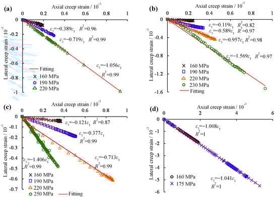 Figure 14 shows the relations between the axial and the lateral creep strains from multi-stepping creep tests of specimens at various temperatures under a σ3 of 25 MPa. It is worth noting that a monotonic linear correlation between the axial and lateral creep strains could be determined for each stress condition. It should be emphasized that the negative sign represents the direction of lateral expansion. From Figure 14, the slopes of the fit lines increased gradually with increasing deviatoric stress, which means lateral deformation became more obvious as the deviatoric stress increased.