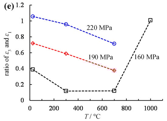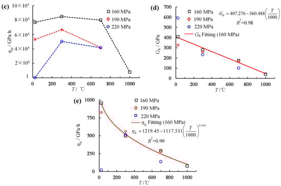 Comparing the slopes of the fit lines at different temperatures in Figure 14a–d, under a deviatoric stress of 160 MPa, the slope first decreased from 0.389 at 25 °C to 0.119 at 300 °C and then increased from 0.121 to 1.008 as the temperature was elevated from 700 °C to 1000 °C, as shown in Figure 14e. However, because the σp of the specimen at 1000 °C was the lowest (207.36 MPa), the specimen experienced creep rupture under a partial stress of 175 MPa. Therefore, the deformations under 190 MPa and 220 MPa could not be obtained, and the corresponding slope value also could not be calculated. As the temperature increased from room temperature to 700 °C, the slopes of the fit lines under deviatoric stresses of 190 and 220 MPa decreased linearly.