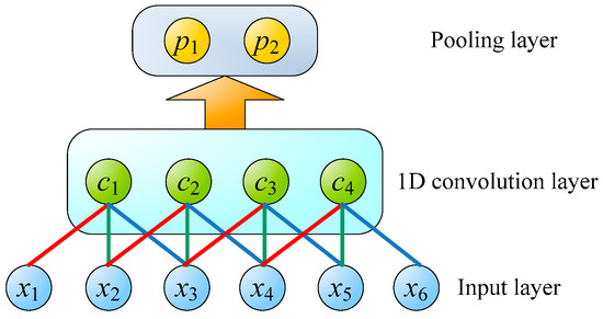 Although MLPs are very good in modelling and patter recognition, the convolutional neural networks (CNNs) provide better accuracy in highly non-linear problems, such as energy load forecasting. The CNN uses the concept of weight sharing. The one-dimensional convolution and pooling layer are presented in Figure 2. The lines in the same color denote the same sharing weight, and sets of the sharing weights can be treated as kernels. After the convolution process, the inputs x1, x2, x3, … , x6 are transformed to the feature maps c1, c2, c3, c4. The next step in Figure 2 is pooling, wherein the feature map of convolution layer is sampled and its dimension is reduced. For instance, in Figure 2 dimension of the feature map is 4, and after pooling process that dimension is reduced to 2. The process of pooling is an important procedure to extract the important convolution features.