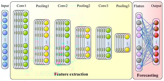 The structure of the proposed deep neural network DeepEnergy is shown in Figure 4. Unlike the general forecasting method based on the LSTM, the DeepEnergy uses the CNN structure. The input layer denotes the information on past load, and the output values represent the future energy load. There are two main processes in DeepEnergy, feature extraction, and forecasting. The feature extraction in DeepEnergy is performed by three convolution layers (Conv1, Conv2, and Conv3) and three pooling layers (Pooling1, Pooling2, and Pooling3). The Conv1–Conv3 are one-dimensional (1D) convolutions, and the feature maps are all activated by the Rectified Linear Unit (ReLU) function. Besides, the kernel sizes of Conv1, Conv2, and Conv3 are 9, 5, 5, respectively, and the depths of the feature maps are 16, 32, 64, respectively. The pooling method of Pooling1 to Pooling3 is the max pooling, and the pooling size is equal to 2. Therefore, after the pooling process, the dimension of the feature map will be divided by 2 to extract the important features of the deeper layers.