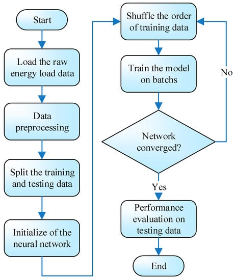 Furthermore, the flowchart of proposed DeepEnergy is represented in Figure 5. Firstly, the raw energy load data are loaded into the memory. Then, the data preprocessing is executed and data are normalized in the range [0, 1] in order to fit the characteristic of the machine learning model. For the purpose of validation of DeepEnergy generalization performance, the data are split into training data and testing data. The training data are used for training of proposed model. After the training process, the proposed DeepEnergy network is created and initialized. Before the training, the training data are randomly shuffled to force the proposed model to learn complicated relationships between input and output data. The training data are split into several batches. According to the order of shuffled data, the model is trained on all of the batches. During the training process, if the desired Mean Square Error (MSE) is not reached in the current epoch, the training will continue until the maximal number of epochs or desired MSE is reached. On the contrary, if the maximal number of epochs is reached, then the training process will stop regardless the MSE value. Final performances are evaluated to demonstrate feasibility and practicability of the proposed method.