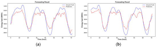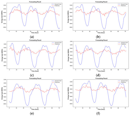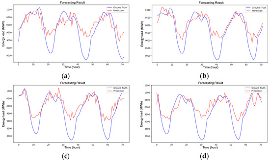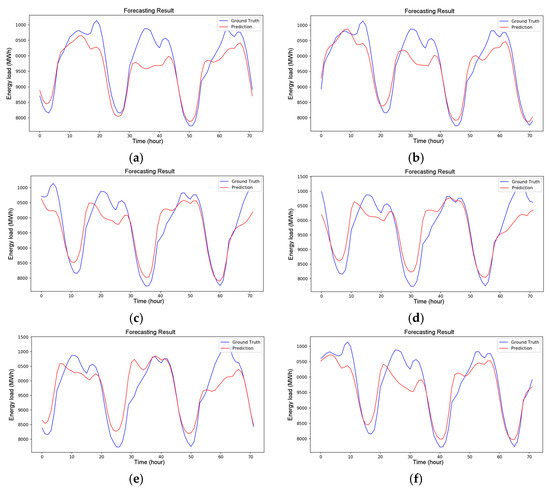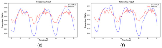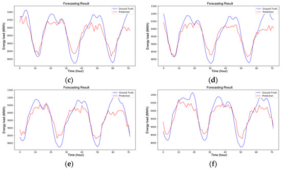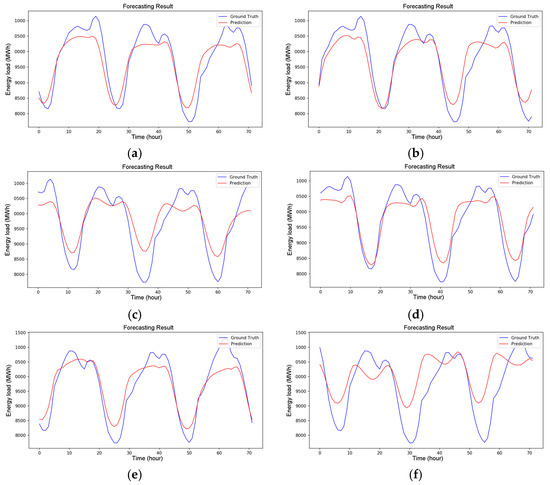 In Figure 6, Figure 7, Figure 8, Figure 9, Figure 10 and Figure 11, red curves denote the forecasting results of the corresponding models, and blue curves represent the ground truth. The vertical axes represent the energy load (MWh), and the horizontal axes denote the time (hour). The energy load from the past (24 × 7) h was used as an input of the forecasting model, and predicted energy load in the next (24 × 3) h was an output of the forecasting model. After the models received the past (24 × 7) h data, they forecasted the next (24 × 3) h energy load, red curves in Figure 6, Figure 7, Figure 8, Figure 9, Figure 10 and Figure 11. Besides, the correct information is illustrated by blue curves. The differences between red and blue curves denote the performances of the corresponding models. For the sake of comparison fairness, testing data were not used during the training process of models. According to the results presented in Figure 6, Figure 7, Figure 8, Figure 9, Figure 10 and Figure 11, the proposed DeepEnergy network has the best prediction performance among all of the models.