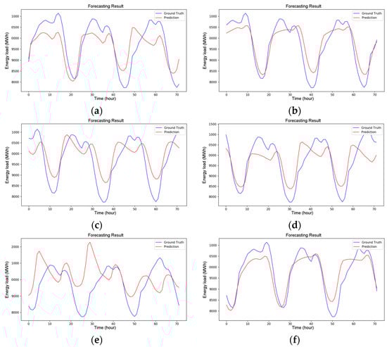 The forecasting results of proposed DeepEnergy: (a) Partial results A; (b) Partial results B; (c) Partial results C; (d) Partial results D; (e) Partial results E; (f) Partial results F.