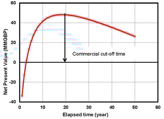 Given the appropriate values for CAPEX, OPEX, discount rate, and years of production, the NPV for a specified degree of heterogeneity was calculated on the annual basis. Having constructed the plot of NPV versus time for each value of HIF, the commercial cut off or operational stopping point was selected to be the maximum NPV. This process is schematically shown in Figure 1 which has been generated using the procedure described below: