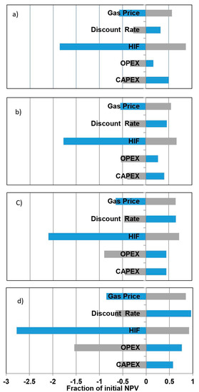 Variation of net present value (NPV) over time for change in different economic parameters and HIF. (a) End of the 5th year of production; (b) End of the 10th year of production; (c) End of the 15th year of production; (d) End of the 20th year of production.