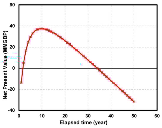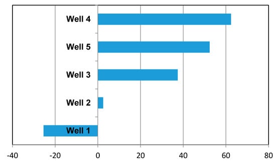 The economic evaluation based on the values given in Table 3 resulted in maximum NPV values of −25.4, 2.5, 37.4, 62.4, and 52.4 MMGBP for well 1 to 5, respectively (Figure 8).