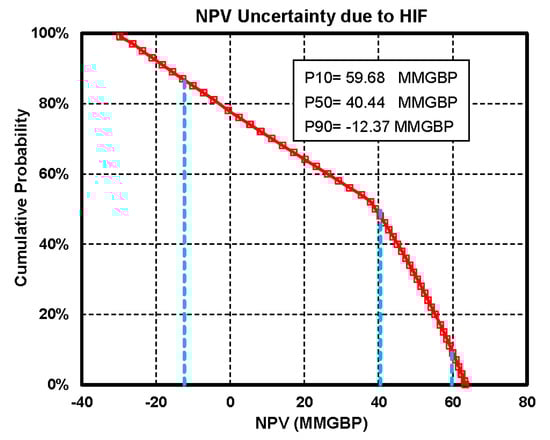 Finally, the cumulative probability of NPV was calculated using 100 realisations and P10, P50, P90 were reported as 60, 40 and −12 million GBP (Figure 7). The proposed term for the risk of commercial failure for this hydraulic fracturing project due to heterogeneity is 1 min the intersection of NPV = 0 and the cumulative NPV probability, i.e., 20%.