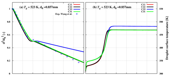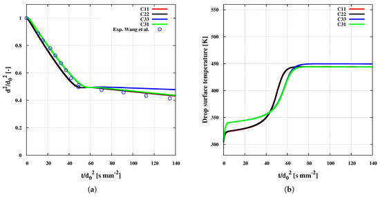 23] to capture the droplet evaporation and species mass fraction at and around the droplet surface. Second, this model will be extended for thermal decomposition of urea in the gaseous phase, where, depending on how the heat of thermal decomposition of urea is provided, different scenarios are considered. Third, since the evaporation model at and around the droplet surface is based on a film approach, how the material properties in the gas film along with the minimum and maximum temperatures expected at the drop surface are evaluated and influences the process results will be investigated. Fourth, the effect of ambient temperature as well as the impact of gravity on the UWS droplet depletion will be pointed out. The prediction capability of the model variants will be assessed by comparing the achieved results to each other and with experimental data. Since the droplet sizes in actual SCR scenarios are much smaller (droplet size 20–200 μm), the available experimental data by Wang et al. [