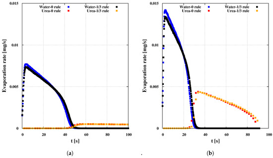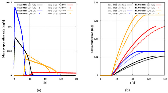 The mass transfer rate for water is only influenced by the gas phase temperature, but not by the scenario mechanisms of thermal decomposition of urea. The urea mass transfer is significantly influenced by both ambient temperatures and reaction mechanisms. The total converted mass of NH