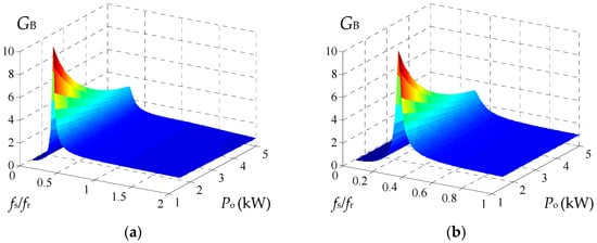 By use of the fundamental harmonic analysis (FHA) method, Figure 5a and Figure 6a show 3D voltage gain curves according to load Po and normalized working frequency fs/fr. GF is gain in forward mode and GB is gain in backward mode. As is shown in Figure 5b and Figure 6b, when the working frequency is below the main resonant frequency, GF and GB increase at first and decrease subsequently with the growth of working frequency. The peak gains are more than 1 over all the load range and obtained around secondary resonant frequency, fr2f and fr2b. At main resonant frequency fr, the gain of the converter is 1. As is shown in Figure 5c and Figure 6c, when working frequency is above main resonant frequency, GF and GB decrease with the growth of working frequency. When load is lighter, the voltage gain is higher and the slope of gain curve is sharper. Voltage gain range of CTLC converter is wide enough to adapt applications like battery charger and DC microgrid.