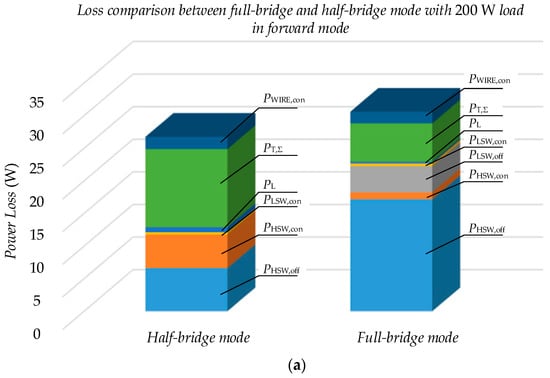 The power loss distribution and comparison between full-bridge and half-bridge configuration with 200 W load: (a) forward mode; (b) backward mode.