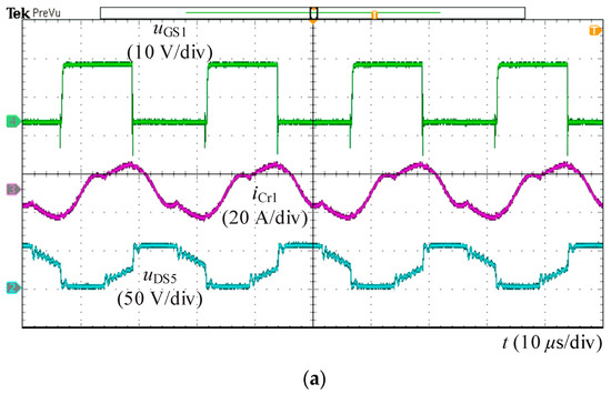 Figure 15 shows experiment results in forward mode. The tSR is 4.6 μs in Figure 15a with working frequency of 60 kHz and load of 3.5 kW. The tSR is 4.5 μs with Equation (25) and 4.3 μs in the proposed synchronous rectification strategy, which is basically consistent with the experiment results. The accuracy of calculation and the effectiveness of proposed synchronous rectification strategy are verified through experiments. Figure 15b shows the waveforms around main resonant frequency. The resonant current is quite close to sinusoidal wave. The power loss is lower because of smaller turn-off loss in this situation.