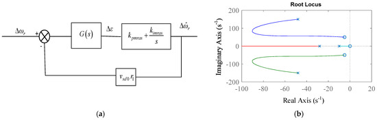 Equation (35) illustrates the transfer function of the variation of input rotation rate and output rotation rate . The block diagram representing the structure of the Q-MRAS based state space is shown in Figure 4a. The root locus plot of Equation (35) for the forward motoring mode is shown in Figure 4b, which represents stability of the speed estimator.