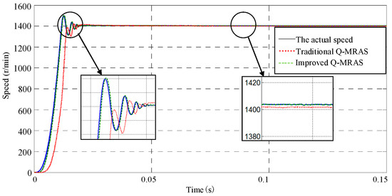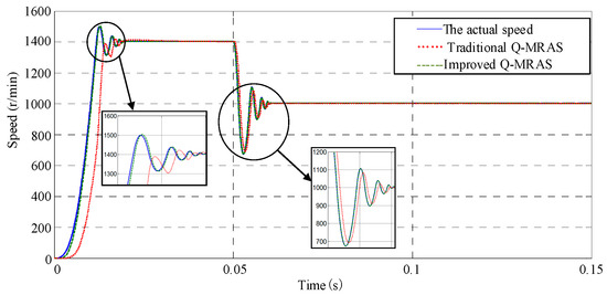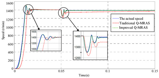 In this work, the induction motor speed is set up at 1400 r/min. When the running time is 0.05 s, the load is changed from 0 Nm to 5.11 Nm. Figure 6 shows the simulation result. When the loads change instantly, the improved Q-MRAS algorithm track follows the change of the actual speed of the induction motor, which represents stability of the speed estimator. However, the conventional Q-MRAS estimation algorithm has a greater lag, and the regulation time is very long, so this method has a poor estimation result.