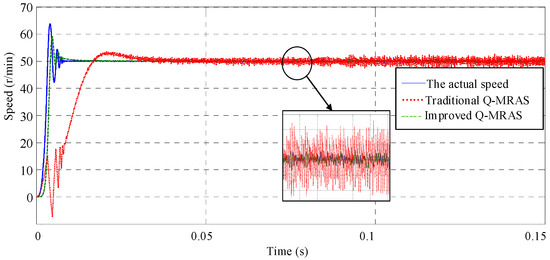 During the startup process, the results estimated by the Q-MRAS algorithm have a significant difference with the actual speed. The results produced by the improved Q-MRAS algorithm are much better, but the tracking result in the startup process has a slight decline. By observing the enlarged figure of the steady state in Figure 8, the estimation results of Q-MRAS have a high level disturbing, which will have a great influence on the speed estimation accuracy. However, the improved Q-MRAS can also follow the actual speed well in the steady state.