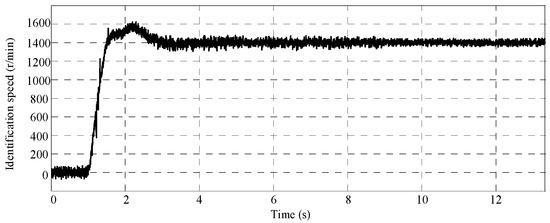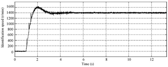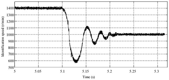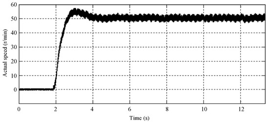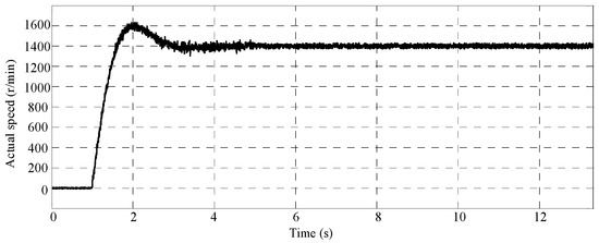 When the motor changes its state from zero load condition to the rated speed condition, the instruction speed of the motor is changed from 1400 r/min to 1000 r/min instantly. The actual speed of the motor is shown in Figure 17.