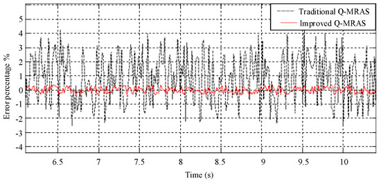 The actual speed of the induction motor is shown in Figure 13, and it is obtained by the encoder in the synchronous motor. Figure 14 and Figure 15 show the speed, which is estimated by the conventional Q-MRAS and improved Q-MRAS algorithm method, respectively. The speed estimated by these two algorithms is almost the same as the actual speed. The tracking performance of the improved Q-MRAS algorithm is better in the startup process. The error comparisons in the static process are shown in Figure 16. The error is greater in the conventional Q-MRAS algorithm, and the error usually fluctuates between −3% and 4%, while the estimation error in the steady state of the improved Q-MRAS algorithm is controlled within ±0.5%.