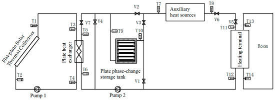The system under investigation is shown in Figure 1 and represents a typical solar heating system with PCM storage tank (SHS-PCM). It is mainly composed of a solar collecting system (SCS), a phase change thermal storage system (PCTSS), and an indoor heating system (IHS). As the main thermal source, SCS is composed of FSTCs, a plate heat exchanger, pump 1, valves, pipelines, etc. As the heating supply source, PCTSS is composed of a PCM storage tank, an AHS, a plate heat exchanger, pump 2, valves, pipelines, etc. The hourly heating load of the IHS is calculated by DeST software (Tsinghua University, Beijing, China), to determine a suitable supply water temperature and backwater temperature for the form of indoor heat exchangers.