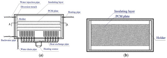 (a) Front view of the phase change material (PCM) storage tank; (b) A–A cross section of the PCM storage tank.