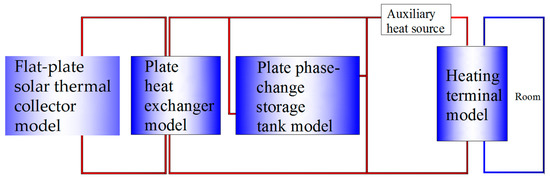 The dynamic simulation model of the system can be simplified into the four sub-models shown in Figure 3, based on the physical model of the SHS-PCM. The dynamic simulation model of the system can be established by solving the problem based on the physical meaning of each sub-model, the equation of the heat transfer process, and the operation control strategy of the system [29].