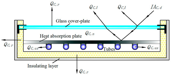 The heat collection process includes heat transfer between the glass cover plate and the environment, heat transfer between the glass cover plate and the heat absorption plate, heat transfer between the heat absorption plate and the bottom plate, and heat transfer between the heat absorption plate and the side panels. The corresponding heat transfer coefficient can be calculated by analyzing each heat transfer process. Therefore, the heat efficiency, the efficiency factor, and the heat transfer factor of the collector can be obtained using the energy conservation equation. A schematic illustration of the energy conservation of a FSTC is shown in Figure 4.