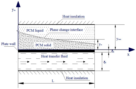 During the transfer of heat between the fluid and the phase change heat storage unit at any given time, the lower part of the PCM is solidified /melted after the release/absorption of latent heat. The lower solid/liquid phase region and the upper liquid/solid phase region are formed next to the boundary of the phase transition interface. The half-layer PCM plate and fluid channel are used to investigate the heat transfer of the PCM storage tank. As indicated in Figure 5, the upper and lower boundaries of the PCM units can be considered as adiabatic surfaces. This is because of the symmetry of the flat phase change thermal storage unit model.
