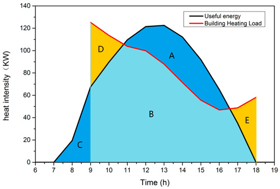 A + B + C is the useful energy collected by FSTCs per day and B + D + E is the total indoor heat load in the diagram. According to the diagram, the heat required for PCMs is the excess solar radiation in the A + C region. A cumulative calculation of the daily heat storage in the heating season is shown in Figure 8.