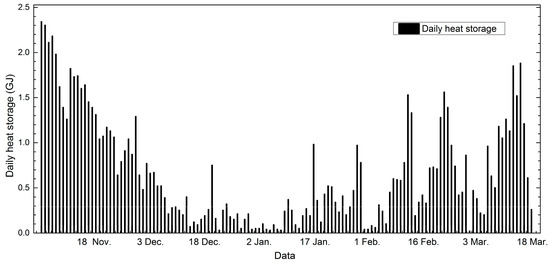 The daily heat storage is calculated in 0.5 GJ intervals in Table 4, and the percentage of days in the heat storage relative to the total number of days in the heating season is obtained. It can be seen that the proportion of days of heat storage below 1 GJ is 53%, the proportion of days under 2 GJ is 84%, and the proportion of days under 2.5 GJ is 94%, while the daily heat storage rate of 0.63 GJ is 35%.