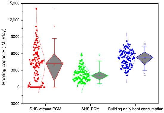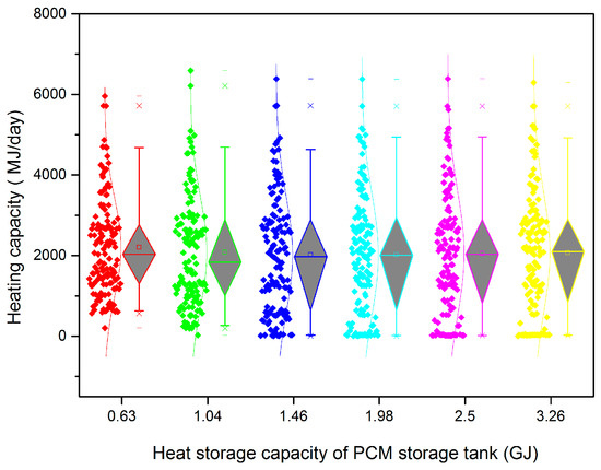 Figure 11 shows the daily energy delivered by the AHS of SHS-PCM during the entire heating season, using PCM storage tanks with different heat storage capacities. It can be seen from the data and box chart that the average daily heat supplied by AHS has not obviously decreased or increased, although the heat storage capacity of the PCM storage tank increases from 0.63 GJ to 3.26 GJ. For the six different heat storage capacities, the heat quantities supplied by AHS are 2202 MJ, 2083 MJ, 2020 MJ, 2023 MJ, 2050 MJ, and 2072 MJ, respectively.