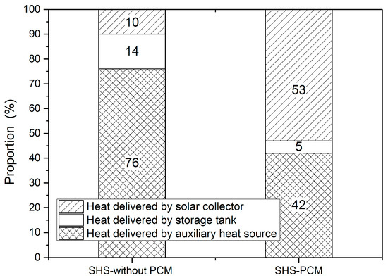 - The operating conditions of SHS-without PCM and SHS-PCM were analyzed in order to explore the contribution rate of ordinary water tanks and PCM storage tanks in a solar heating system. The results show that an SHS-PCM system saves 34% more energy than an ordinary water tank heating system. In addition, after the PCM storage tank is adopted, the water tank volume is reduced to 1/5 the size of the ordinary water tank. Because more solar energy is supplied directly from the FSTCs to the indoor terminals and owing to the PCM storage tank’s relatively low contribution to the heating of the terminal, it is necessary to optimize the selection of the PCM storage tank.