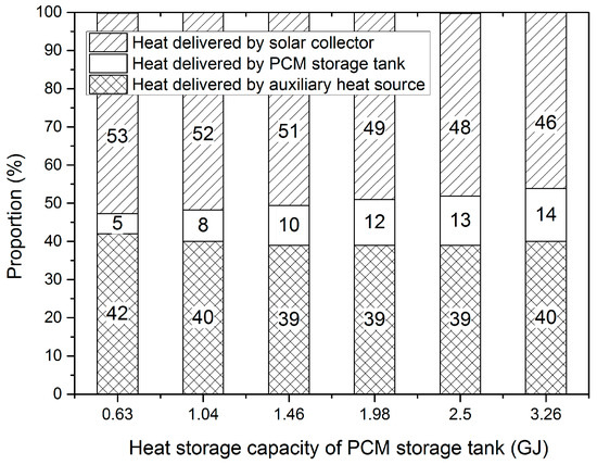 Proportions of heat supplied by AHS, PCM storage tank, and FSTCs direct heating, with different capacities of PCM storage tanks.