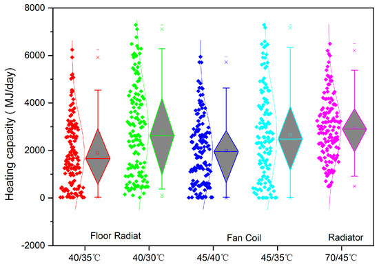 Figure 13 shows the daily energy delivered by the AHS of SHS-PCM with different terminal forms and different supply/return water temperatures during the entire heating season. The data and box chart show that the selected terminal forms and the supply/return water temperatures are as follows: floor radiation (40/35 °C), floor radiation (40/30 °C), fan coil (45/40 °C), fan coil (45/35 °C), and radiator (70/45 °C). The corresponding average daily heat supplied by the AHS is 1898 MJ/day, 2824 MJ/day, 1988 MJ/day, 2660 MJ/day, and 2939 MJ/day. Among these, floor radiation (40/35 °C) has the minimum AHS requirement while radiator (70/45 °C) has the maximum AHS requirement.