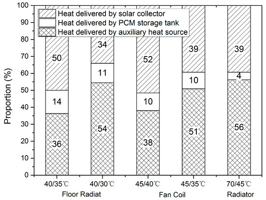 Figure 14 shows the proportion of heat supplied to SHS-PCM by three heat sources (AHS, PCM storage tank, and FSTCs direct heating) over the entire heating season, water storage tank with different terminal forms and heating temperatures. The selected terminal forms and the supply/return water temperatures are as follows: floor radiation (40/35 °C), floor radiation (40/30 °C), fan coil (45/40 °C), fan coil (45/35 °C), and radiator (70/45 °C). The corresponding proportions of heat supplied by AHS are 14%, 11%, 10%, 10%, and 4%. The proportions of heat supplied by FSTCs direct heating are 50%, 34%, 52%, 39%, and 39%. The above statistics show that the highest proportion of solar energy utilization is in the system with floor radiation (40/35 °C), in which the utilization rate of solar energy can reach 64%. This is mainly because the lower the supply heating temperature, the easier the PCM tank and the FSTCs direct heating are satisfied the requirements, thereby reducing the operation time of AHS.