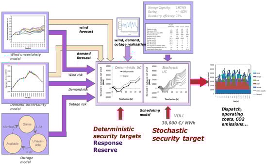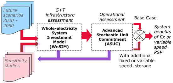 As shown in Figure 1, the combination of a deterministic system planning tool (i.e., the Whole-electricity System Investment Model (WeSIM)) and a stochastic system operation optimisation tool (i.e., the Advanced Stochastic Unit Commitment (ASUC)) is used to analyse and quantify the system benefits of PSP technologies. The approach decouples the planning problem (which considers a large number of operating snapshots in a year (or multiple years) to determine the impact of certain technologies on the system capacity requirements) from the operational problem (which explicitly considers the uncertainty, especially with respect to RES output). The operational model (ASUC) allocates a sufficient amount of operating reserves and frequency response across the system, while balancing the associated costs and benefits, to provide an adequate system balancing capability.