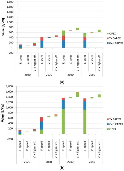 Capitalised values of PSP technologies. (a) Low RES scenario; (b) High RES scenario.