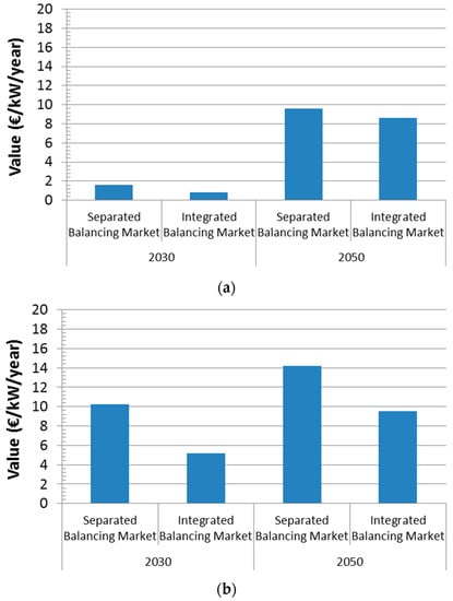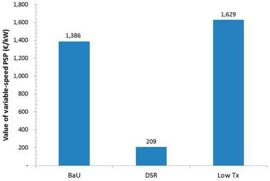 Values of PSP technologies. (a) Low renewable energy resources (RES) scenario; (b) High renewable energy resources (RES) scenario.