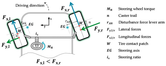 The basic idea of e2-Lenk is as follows: Different torques applied to the left and right wheels can influence the driver’s steering torque in the sense of power-assisted steering. This is achieved via the driving forces acting on the wheel contact patch W, which, together with the acting lever arms of the wheel suspension, result in a steering torque around the steering axis EG. The produced steering torque counteracts the self-centering effect caused by the lateral forces and the caster trail n (see Figure 1).