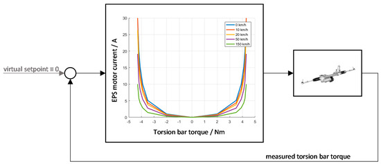 Regarding to Harrer and Pfeffer [8], all classical control plans for conventional power steering systems have in common that they emulate the functions of a hydraulic power steering system: a suitable assistance torque is applied by the power steering system as a function of the driver’s steering wheel torque respectively the torsion bar torque. This structure can be interpreted as a P control algorithm with a virtual set point of 0 Nm and variable gain (see Figure 2). The steering feel is the resulting residual deviation of the P controller that can be adjusted by the power assistance characteristic curves. Classical characteristic curves increase the P gain factor with rising deviation. Thus, a rising torsion bar torque leads to a rising assistance torque which produces a degressive steering wheel torque over lateral acceleration.